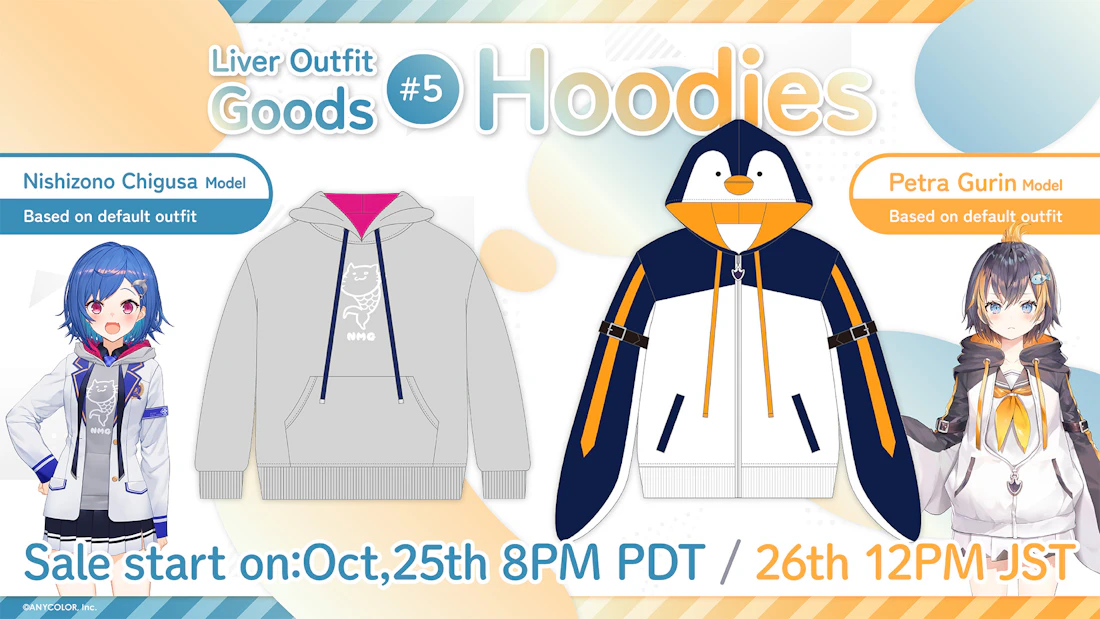 Operated by ANYCOLOR Inc. NIJISANJI & NIJISANJI EN are releasing “Liver Outfit Goods”! For the fifth installment of the project, hoodies based on Nishizono Chigusa and Petra Gurin’s default outfit will be available on both NIJISANJI Official and NIJISANJI EN Official Store starting October 25th (Tue) 20:00 PDT!