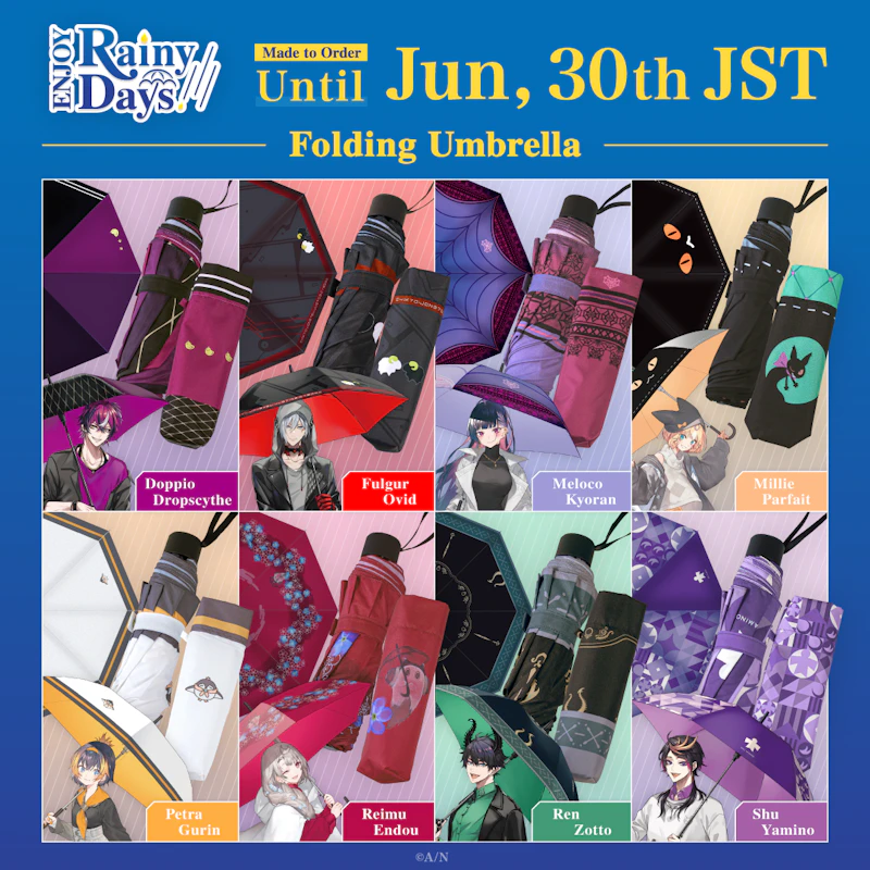 Operated by ANYCOLOR Inc., NIJISANJI EN announces the release of new ““ENJOY Rainy Days”. ““ENJOY Rainy Days'' merchandise will be available on the NIJISANJI EN Official Store starting from June 12th (Wed), 19:00 PDT!