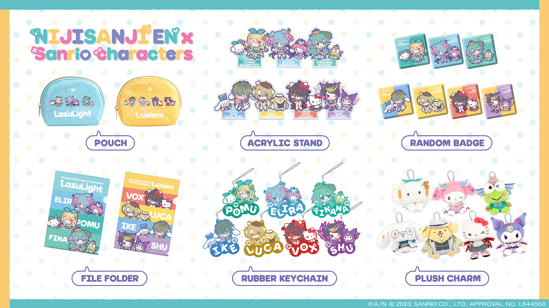 A total of six types of merchandise will be available: Acrylic Stand, Rubber Keychain, Random Badge, File Folder and Pouch, and Plush Charm (made-to-order).