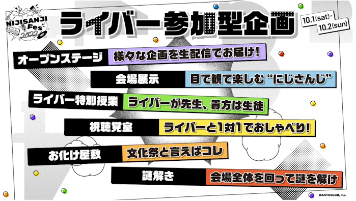 メインステージには多くのライバーが3Dで登場。ライブ、トーク、ゲーム実況、演劇など2日間で計6つのステージプログラムを展開します。ライバー参加型企画では、ライバーと1対1でトークとチェキ撮影ができる視聴覚室、ライバーが先生となって授業をするライバー特別授業、会場全体を使った謎解き、お化け屋敷、プラネタリウムなど会場でしか体験できない企画が満載のイベントです。