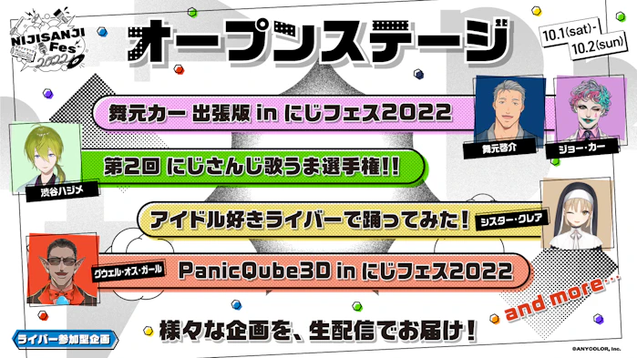 ANYCOLOR株式会社(本社:東京都港区 代表取締役:田角陸、以下「当社」)が運営するVTuber / バーチャルライバーグループ「にじさんじ」は、「にじさんじフェス2022」の全ステージプログラム、ライバー参加型企画の出演ライバー情報、グッズ第1弾先行販売情報をお伝えします。