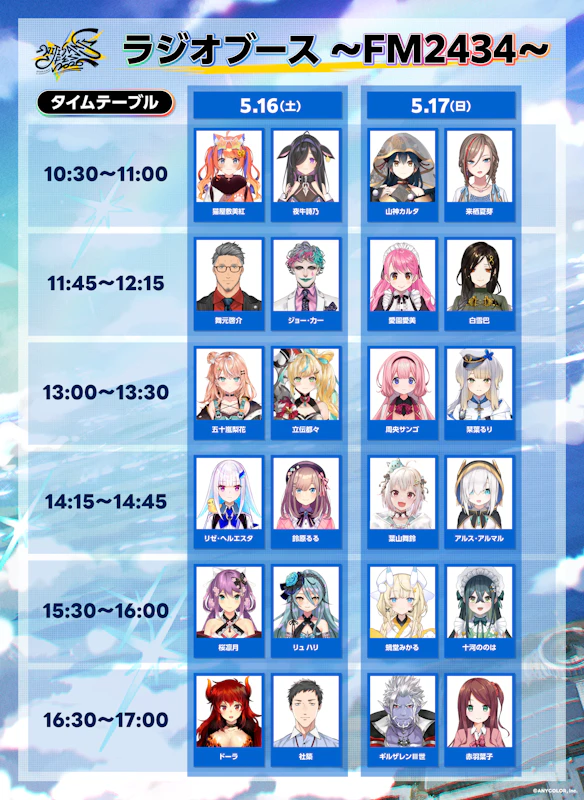 さらに、大人気の着ぐるみ&リアルヒーローが登場する「にじさんじグリーティングストリート」および、「ラジオブース〜FM2434〜」のスケジュールも公開!会場を余すことなく楽しめる魅力が満載となっています。