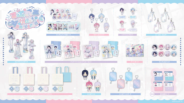 グッズラインナップは、撮りおろしビジュアルを使用したラメアクリルスタンド、ランダムチェキ風カード、ランダム缶バッジ、ラバーストラップ、アートボード、クリアファイル&ステッカーセット、ヘアクリップセット。