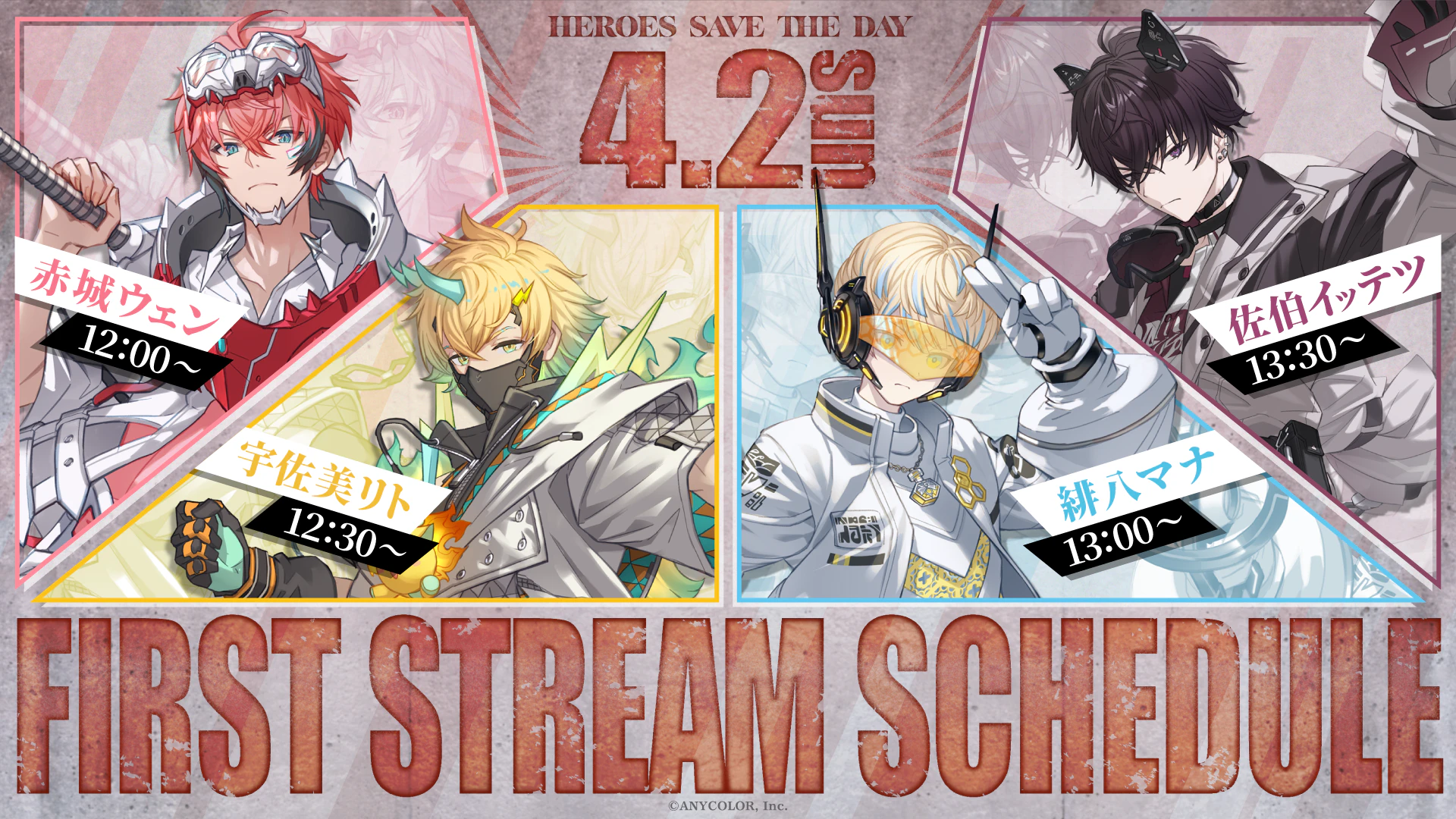 YouTubeでの初配信は各ライバーのチャンネルにて、2023年4月2日(日)12:00よりリレー形式で行います。ぜひ佐伯イッテツ、赤城ウェン、宇佐美リト、緋八マナの初配信をご覧ください。
