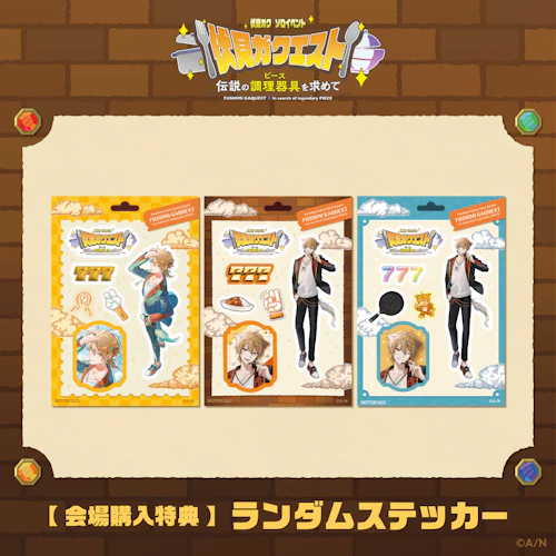 「伏見ガクエスト 〜伝説の調理器具(ピース)を求めて〜」アイテム販売ブースでは、対象商品のご購入3,000円(税込)毎に「ランダムステッカー(全3種)」を1点プレゼントいたします。
