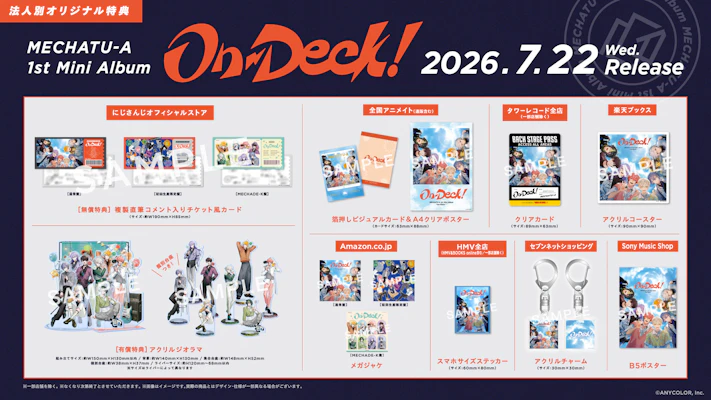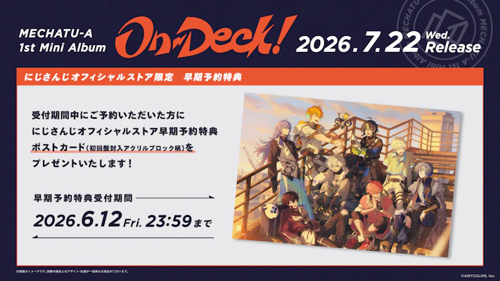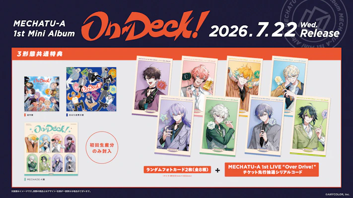 当社が運営するバーチャルライバーグループ「にじさんじ」所属VTuberである佐伯イッテツ、赤城ウェン、宇佐美リト、緋八マナ、星導ショウ、叢雲カゲツ、小柳ロウ、伊波ライからなるユニット「MECHATU-A」が、1st Mini Album「On-Deck!」を2026年7月22日(水)に発売することが決定!本日2026年4月28日(火)21:30より順次予約開始!