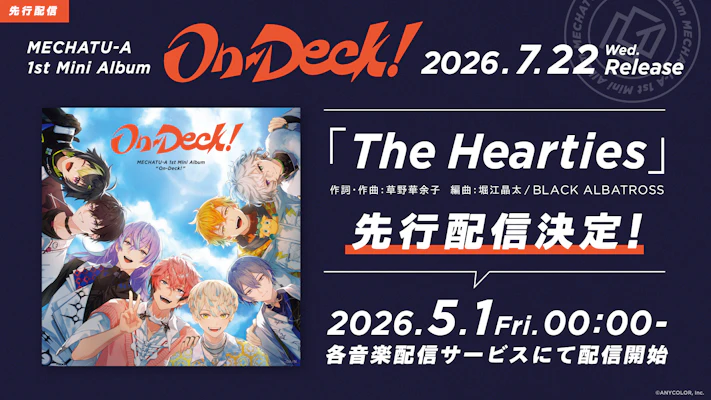 MECHATU-A 1st Mini Album「On-Deck!」収録曲の「The Hearties」について、2026年5月1日(金)0:00から先行配信開始、5月10日(日)21:00にMV公開が決定!