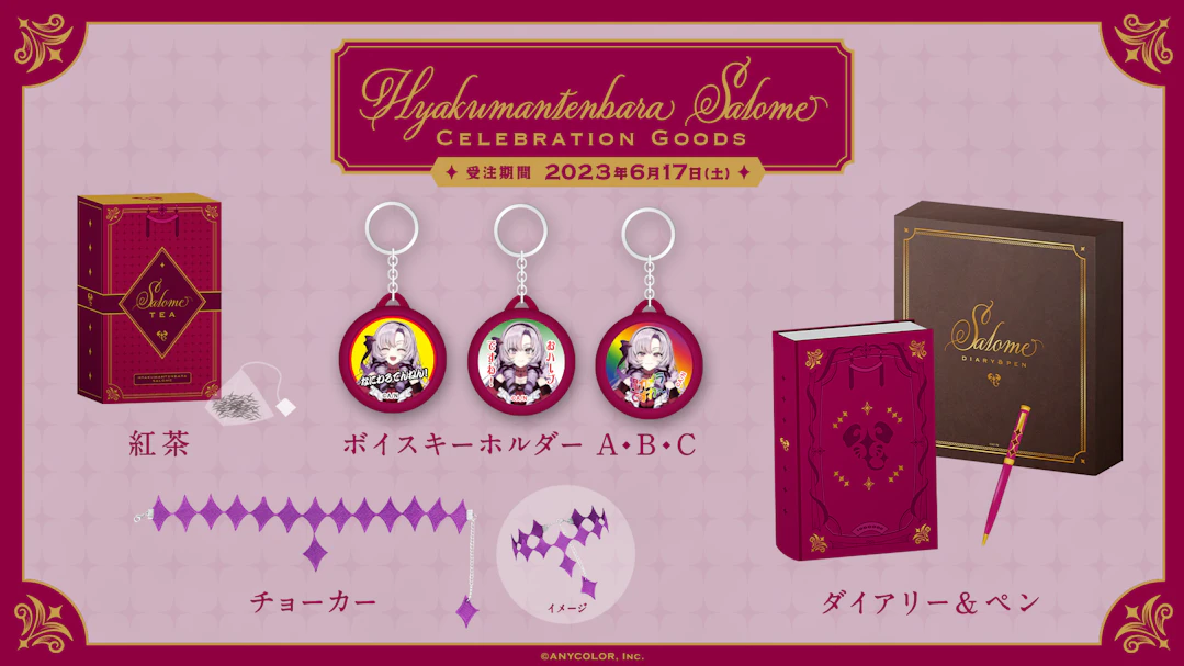 グッズラインナップは、壱百満天原サロメ本人がプロデュースしたチョーカー、ダイアリー&ペン、ボイスキーホルダー、紅茶の4種類。