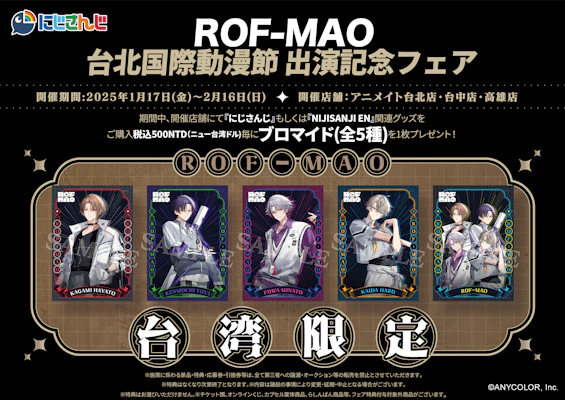 また、初出演を記念して2025年1月17日(金)から2025年2月16日(日)までの期間、アニメイト台北店・台中店・高雄店にて「ROF-MAO 台北国際動漫節 出演記念フェア」を開催いたします。