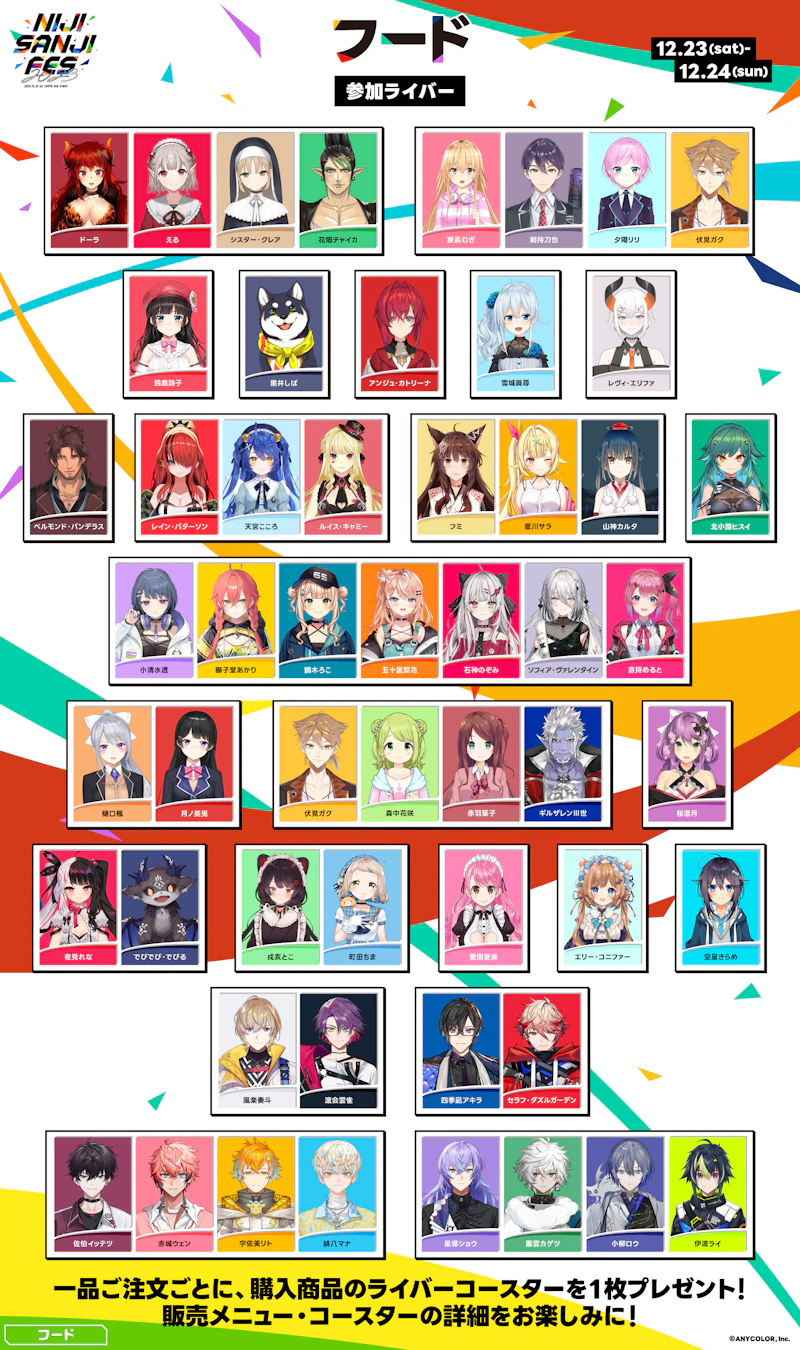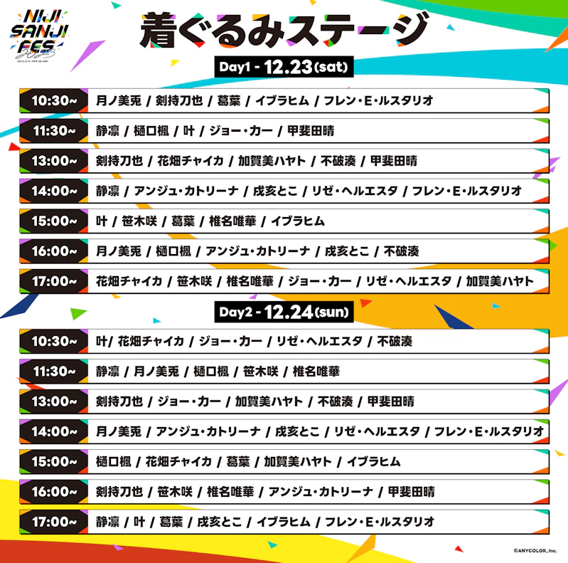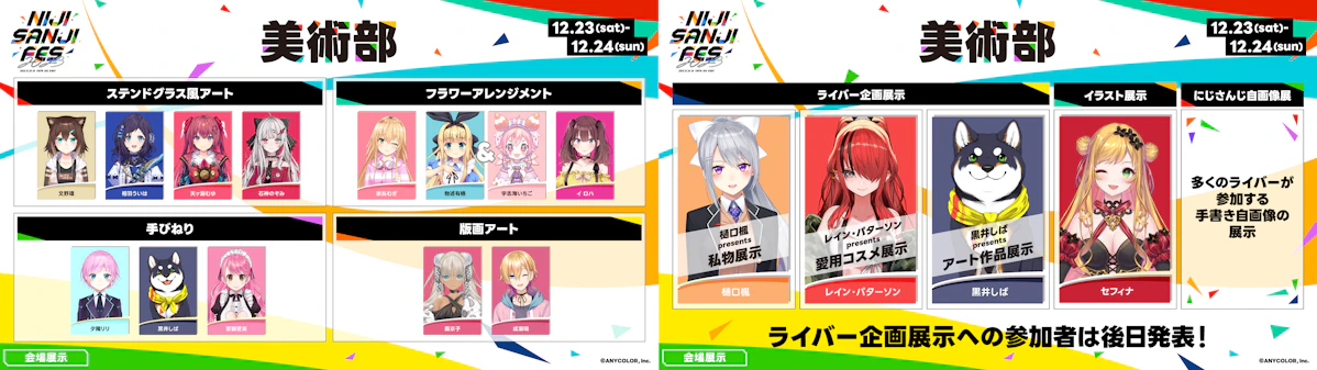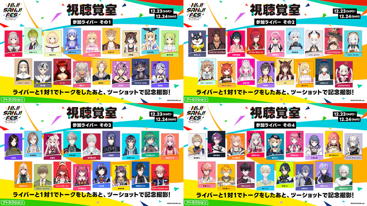 展示ライバー:月ノ美兎 / 樋口楓 / 剣持刀也 / 伏見ガク / 叶 / 卯月コウ / 社築 / 緑仙 / 笹木咲 / 椎名唯華 / 魔界ノりりむ/ ジョー・力一 / 夢追翔 / 戌亥とこ / リゼ・ヘルエスタ / 三枝明那 / 加賀美ハヤト / 葉加瀬冬雪 / 夜見れな / 相羽ういは / シェリン・バーガンディ / 星川サラ / 白雪巴 / 不破湊 / フレン・E・ルスタリオ / 長尾景 / レイン・パターソン / レオス・ヴィンセント / 壱百満天原サロメ / 渡会雲雀