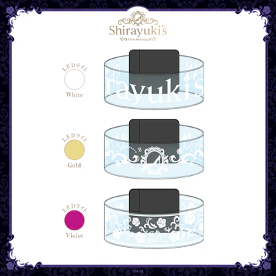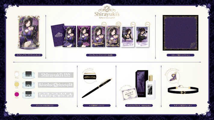 グッズラインナップは、ラグジュアリーアクリルスタンド、ランダムミニブロマイド、ブレスレットLEDライト、スカーフ風マルチクロス、ロゴ刻印ボールペン、ルームフレグランス -Shirayuki-、モチーフ付きチョーカーの全7種。