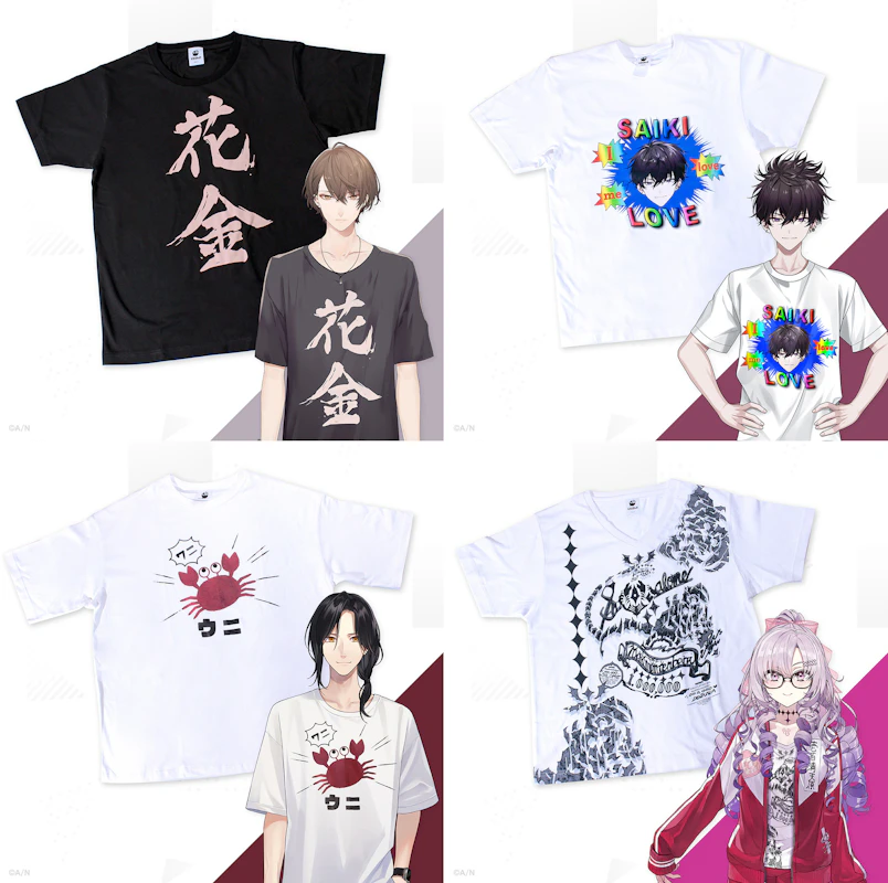 第9弾では「加賀美ハヤト」「佐伯イッテツ」「シェリン・バーガンディ」「壱百満天原サロメ」が身につけているTシャツを商品化!