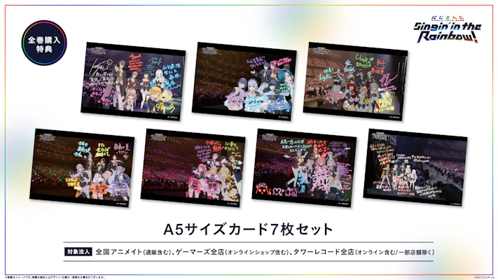 アニメイト、ゲーマーズ、タワーレコードの同一店舗(通販を含む)で「にじさんじ WORLD TOUR 2025 Singin’ in the Rainbow!」のBlu-ray全7商品をご予約・購入いただくと、全巻購入特典として「A5サイズカード7枚セット」をプレゼントいたします。