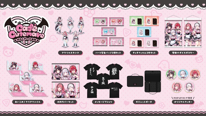 グッズラインナップは、ハート型缶バッジ2個セット、アクリルスタンド、チェキフィルム2枚セット、大判ラバーマット、壁掛けボイスポスター、メッセージTシャツ、あいこめ!クリアファイル、ガジェットポーチ、オリジナルクッキー(POPUPストア限定)の9種類!
