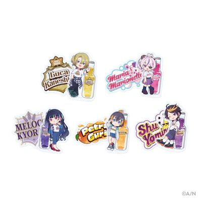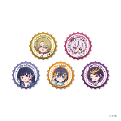 ラインナップは、撮りおろしのデフォルメビジュアルを使用したアクリルキーホルダー、王冠缶バッジ、そしてライバーごとのモチーフロゴを使用したクリアカードセットの計3種。