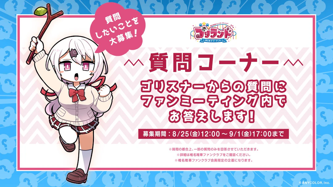 ANYCOLOR株式会社(本社:東京都港区 代表取締役:田角陸、以下「当社」)が運営するVTuber / バーチャルライバーグループ「にじさんじ」は、当社所属ライバー椎名唯華による初のファンミーティング『ゴリランド』を2023年9月30日(土)に開催いたします。