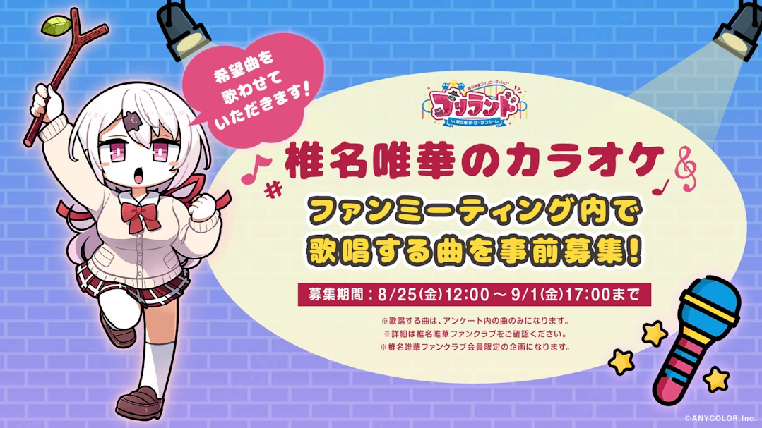 椎名唯華、初のファンミーティング! ライバーと一緒に楽しめる企画や歌唱パートに加え、数量限定のプレミアムチケットには終演後個別トーク & 2ショット撮影などの特典も!