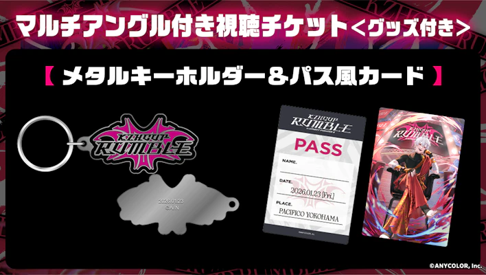 アーカイブ配信は「マルチアングル付き視聴チケット」でのみ視聴可能で、メタルキーホルダーとパス風カードが付属する、グッズ付きチケットも販売いたします。