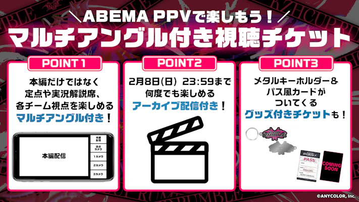 また、決勝戦/エキシビションマッチはABEMA(アベマ)にて全編無料配信を実施します。加えて、マルチアングル付き視聴チケット(有料チケット)でもアーカイブ配信やマルチアングルの視点をお楽しみいただけます。