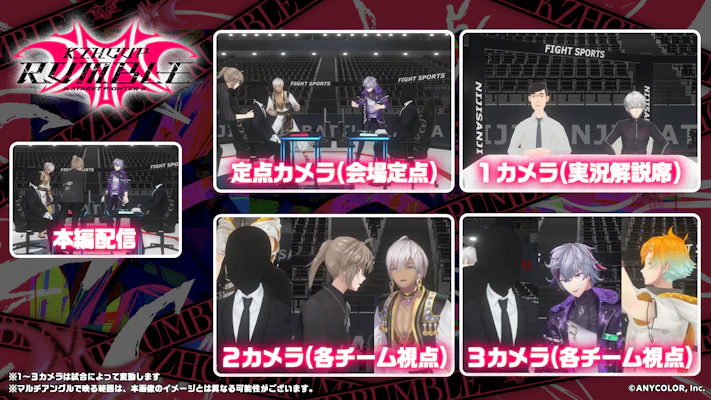 決勝戦では、「会場定点」「2チーム各視点」「実況解説席」
