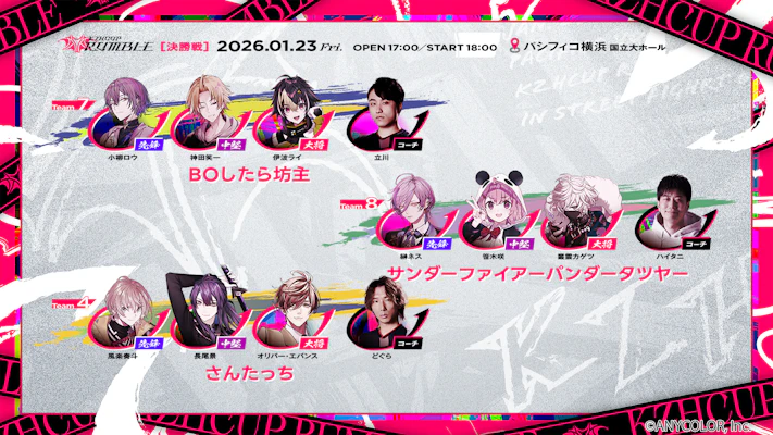 「KZHCUP RUMBLE in STREET FIGHTER 6」は、2025年12月21日(日)に開催された予選(https://www.youtube.com/live/hSFqbQB4E)を勝ち上がった全3チーム(BOしたら坊主、サンダーファイアーパンダータツヤー、さんたっち)が、2026年1月23日(金)に会場であるパシフィコ横浜 国立大ホールに参戦し、決勝戦を行います。加えて同日にはエキシビションマッチとして、にじさんじライバー5名とストリーマー5名が対戦するTeam KUZUHA vs Team STREAMERも開催いたします。