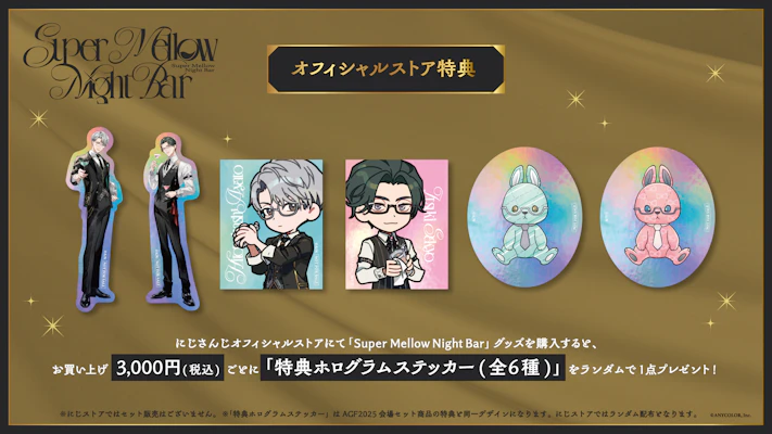 にじさんじオフィシャルストアにて「Super Mellow Night Bar」グッズを購入すると、お買い上げ3,000円(税込)ごとに 「ホログラムステッカー(全6種)」をランダムで1枚プレゼントいたします。