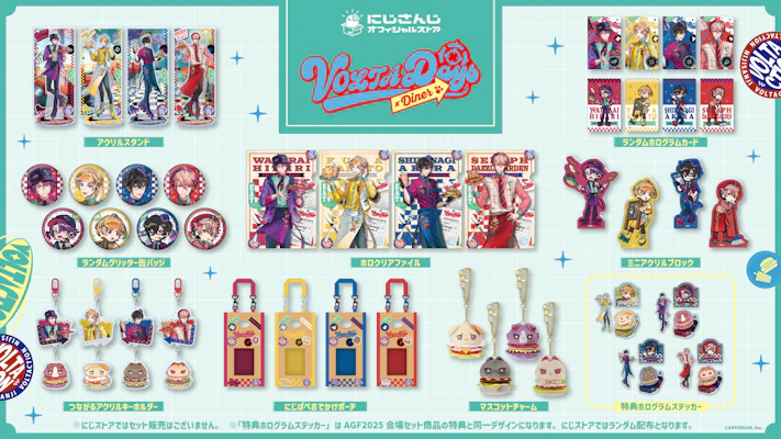「AGF2025」会場物販では、にじストアにて単品販売を行う「VOLTA Days × Diner」「Super Mellow Night Bar」グッズのライバーごとのセット販売と、ランダムグッズの先行販売を行います。