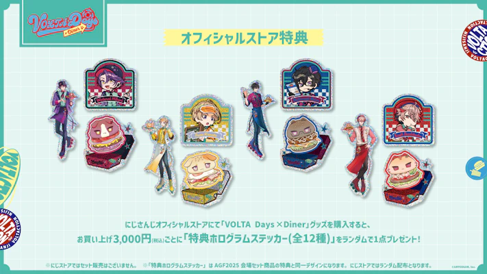 にじさんじオフィシャルストアにて「VOLTA Days × Diner」グッズを購入すると、お買い上げ3,000円(税込)ごとに 「ホログラムステッカー(全12種)」をランダムで1枚プレゼントいたします。