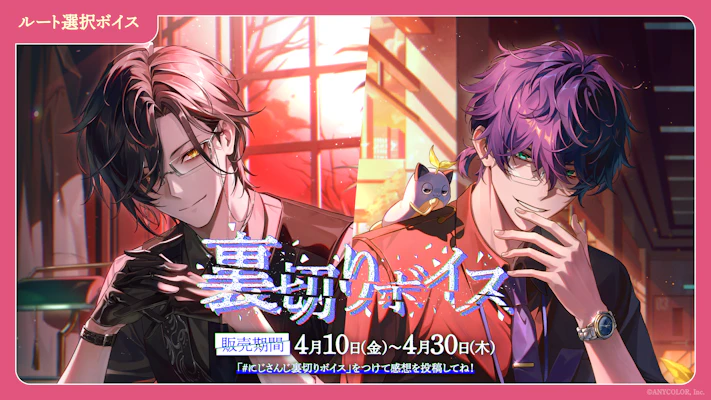 2026年4月10日(金)12時から2026年4月30日(木)23時59分までの期間、にじさんじオフィシャルストア(https://shop.nijisanji.jp)と、NIJISANJI EN Official Store(https://nijisanji-store.com)にて「にじさんじ ふたりの秘密ボイス」「にじさんじ 裏切りボイス」の販売をいたします。