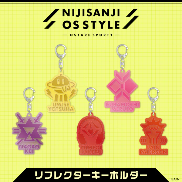 海妹四葉、倉持めると、長尾景、夢追翔、レイン・パターソンが参加する「NIJISANJI OS Style」グッズのラインナップは、アクリルスタンド、ビッグ缶バッジ、ランダムクリアカード、リフレクターキーホルダー、ポーチの全5種。