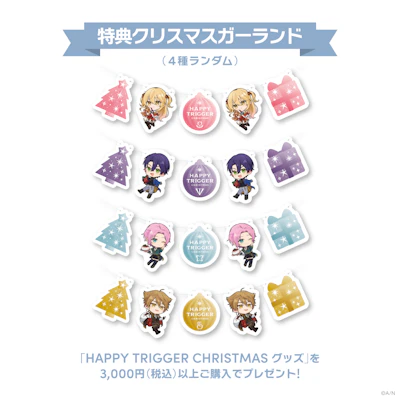 にじさんじオフィシャルストアにて『HAPPY TRIGGER CHRISTMAS』グッズを購入すると、お買い上げ3,000円(税込)ごとに「特典クリスマスガーランド(全4種)」をランダムで1点プレゼントいたします。