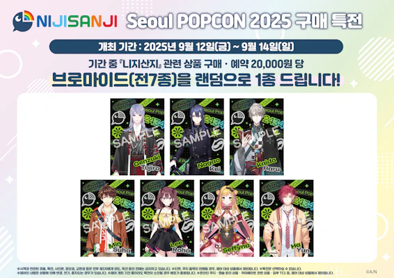 イベント期間中、にじさんじブースでグッズを購入するとお買い上げ20,000ウォン(税込)ごとにブロマイド(全7種)をランダムで1点プレゼントいたします。