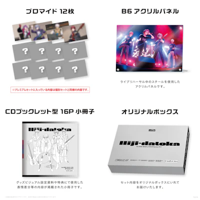 ブロマイド3枚セット×4種(全12枚)、ライブリハーサル中のスチールを使用したB6サイズのアクリルパネル、グッズビジュアル設定資料や特典にて使用した表情差分等の内容が掲載されたCDブックレット型16P小冊子をオリジナルボックスでお届けするプレミアムセットです。