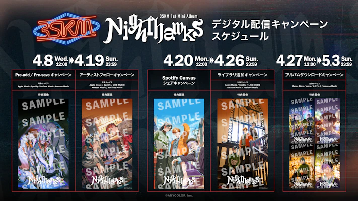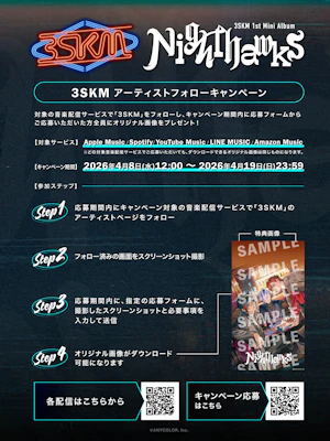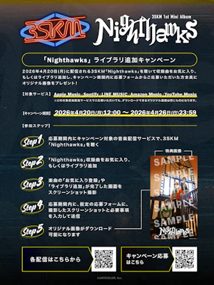 さらに、いち早くアルバム楽曲を試聴することが出来る「3SKM ‘Nighthawks’ Highlight Medley」が、2026年4月8日(水)12時より、3SKM 公式YouTubeチャンネルで公開されました。
